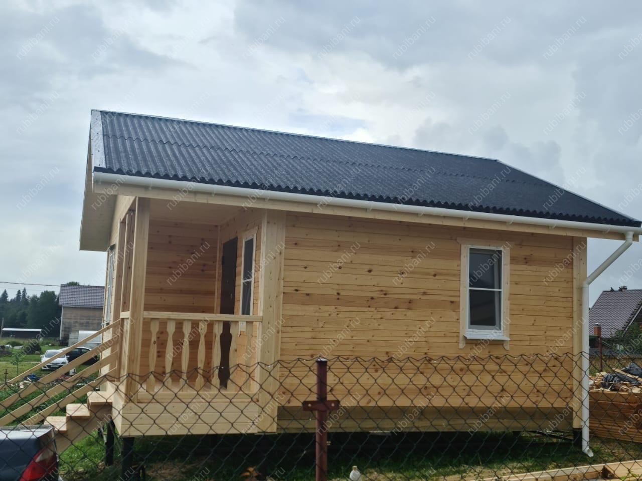Конструкция бани и веранды выполнена из профилированного бруса, обеспечивающего отличную теплоизоляцию и долговечность. Компактная веранда существенно расширяет полезную площадь, создавая плавный переход между интерьером бани и окружающей природой, не нарушая гармонии участка.