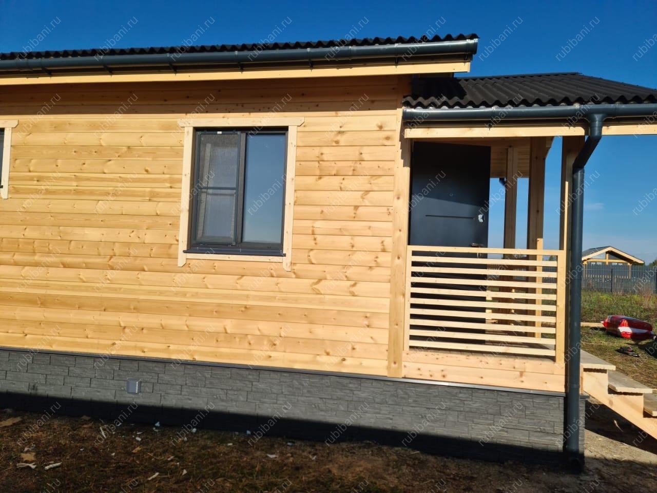 Визитной карточкой проекта стало стильное крыльцо с надежными ступенями и защитным козырьком, тщательно интегрированное в общий дизайн бани, подчеркивая качество исполнения и добавляя респектабельности фасаду.